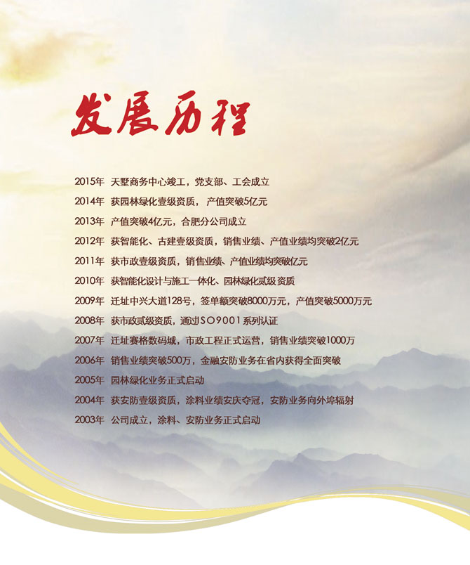 公司先后通过了ISO9001、ISO14001、OHSAS18001、GB/T50430管理体系认证,并以创造精品为目标,在不断服务客户完善自身的同时,取得了良好的社会效益。自创办以来,先后获得“守合同重信用单位”、“诚信标兵”、“先进企业”、“金融守信单位”、“AAA级信用企业”、“优秀民营企业”、“园林绿化施工先进企业”、“安徽省优秀建筑业企业”、“安徽省A级纳税信用企业”、“21315全国质量信用AAA企业”、“黄山杯”、“振风杯”等多项荣誉称号。